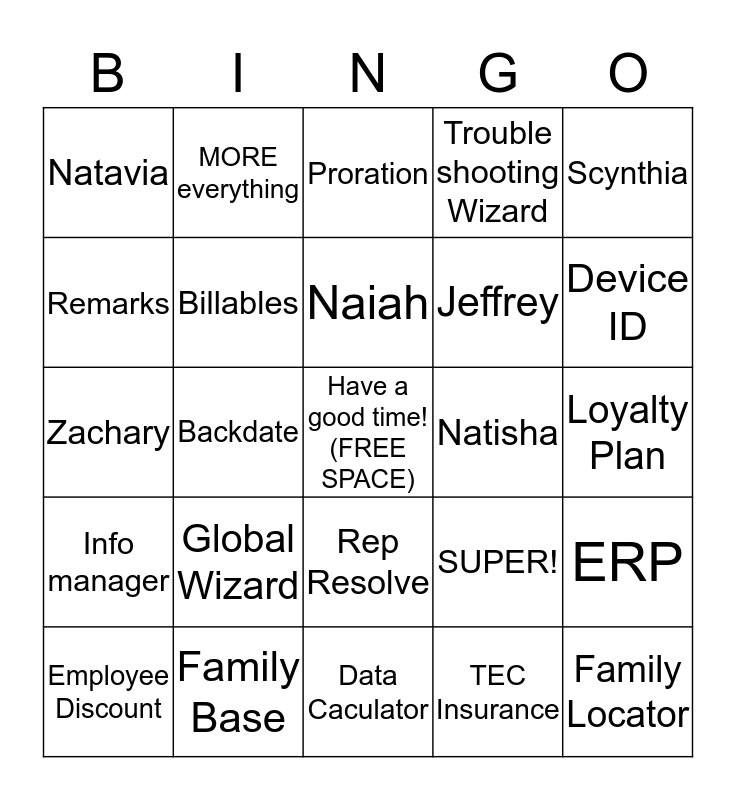 This bingo card has a free space and 24 words: Global Wizard, Family Base, Naiah, Employee Discount, Scynthia, Natavia, Remarks, MORE everything, Natisha, Rep Resolve, Jeffrey, Zachary, SUPER!, ERP, Billables, TEC Insurance, Loyalty Plan, Proration, Device ID, Backdate, Family Locator, Info manager, Trouble shooting Wizard and Data Caculator.