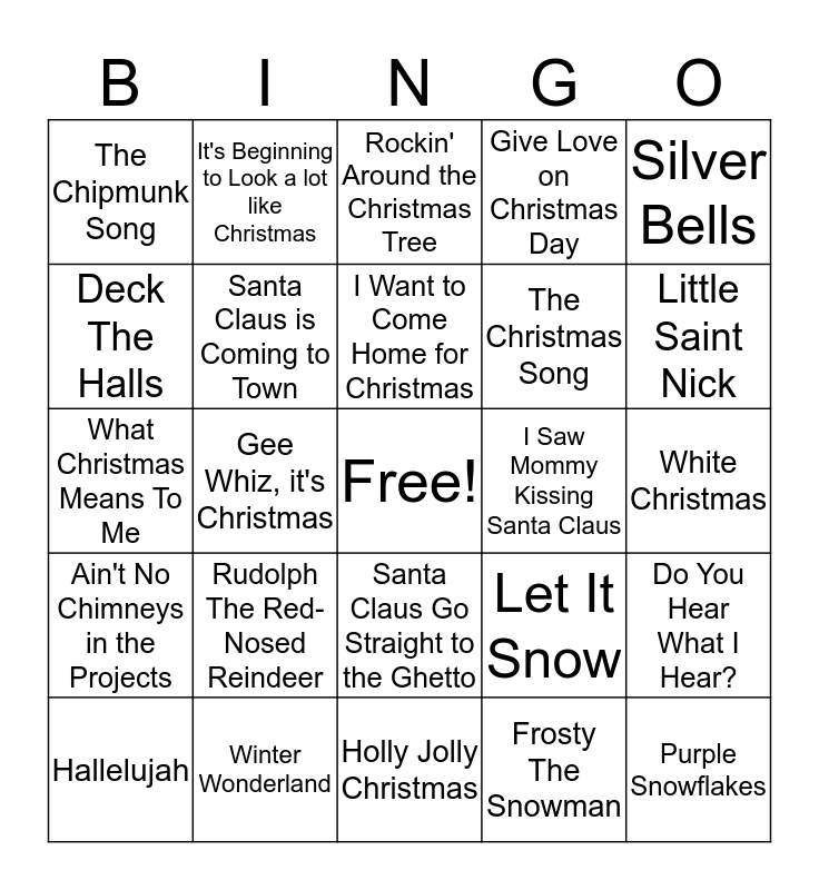 This bingo card has a free space and 41 words: This Christmas, What Christmas Means To Me, Silent Night, Santa Claus is Coming to Town, Winter Wonderland, Santa Claus Go Straight to the Ghetto, I Want to Come Home for Christmas, Santa Baby, Silver Bells, Ain't No Chimneys in the Projects, Gee Whiz, it's Christmas, Give Love on Christmas Day, Purple Snowflakes, White Christmas, I Saw Mommy Kissing Santa Claus, Rudolph The Red-Nosed Reindeer, Jingle Bells, The Chipmunk Song, Have Yourself a Merry Little Christmas, Rockin' Around the Christmas Tree, Do You Hear What I Hear?, Sleigh Ride, Holly Jolly Christmas, The Christmas Song, Feliz Navidad, All I Want for Christmas is my Two Front Teeth, Frosty The Snowman, There's No Place Like Home for the Holidays, Little Saint Nick, All I Want for Christmas is You, Jingle Bell Rock, It's Beginning to Look a lot like Christmas, Hallelujah, It's the Most Wonderful Time of the Year, Let It Snow, Deck The Halls, Mary Did You Know?, Oh Holy Night, You're a mean one Mr. Grinch, Happy Christmas and Someday at Christmas.