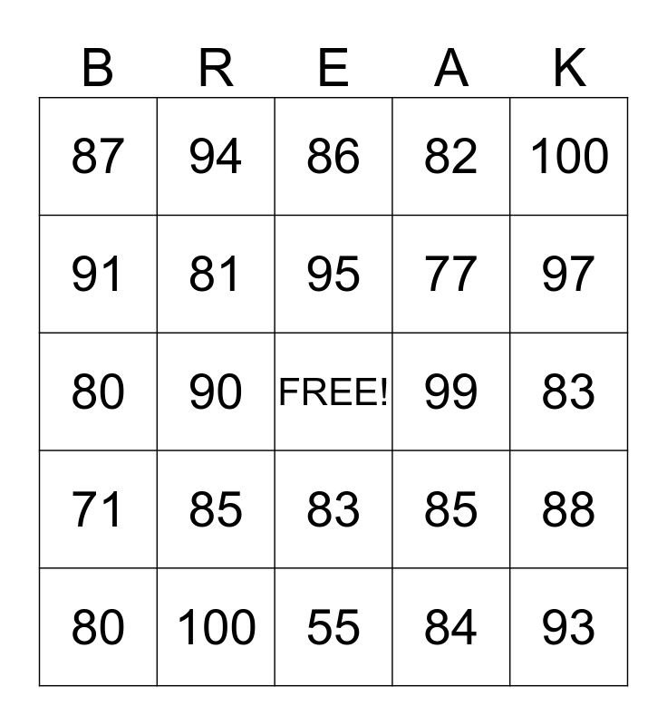 This bingo card has a free space and 24 words: 85, 100, 95, 80, 100, 87, 91, 94, 99, 83, 77, 80, 85, 88, 81, 84, 83, 86, 97, 90, 93, 71, 82 and 55.