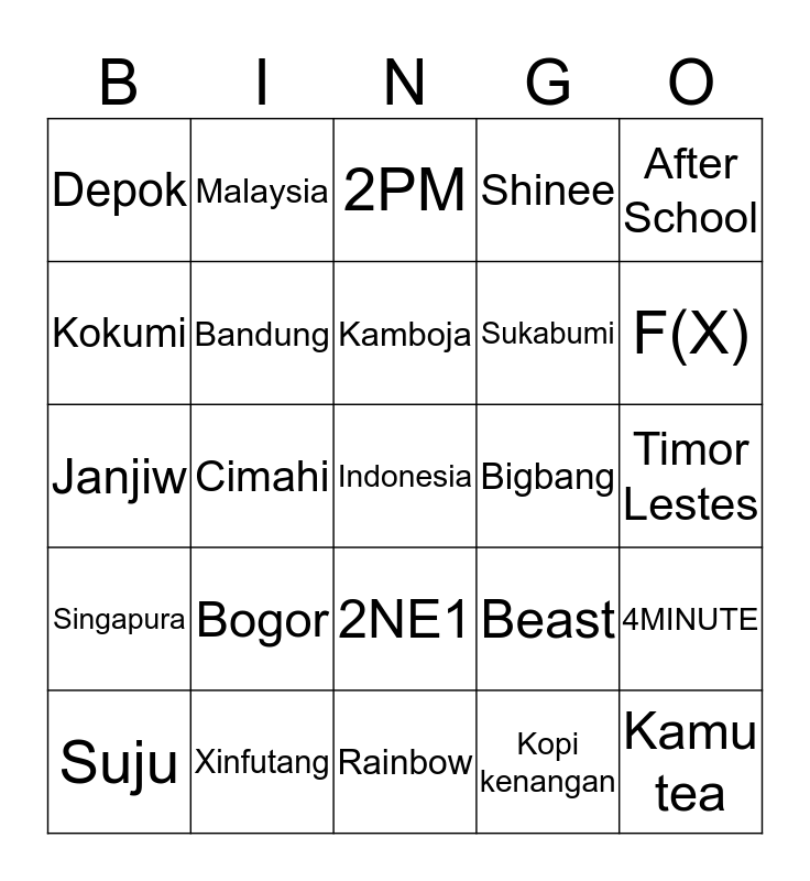 This bingo card has a free space and 24 words: Bogor, Xinfutang, Kamboja, Suju, After School, Depok, Kokumi, Malaysia, Bigbang, 2NE1, Sukabumi, Janjiw, Beast, 4MINUTE, Bandung, Kopi kenangan, Timor Lestes, 2PM, F(X), Cimahi, Kamu tea, Singapura, Shinee and Rainbow.