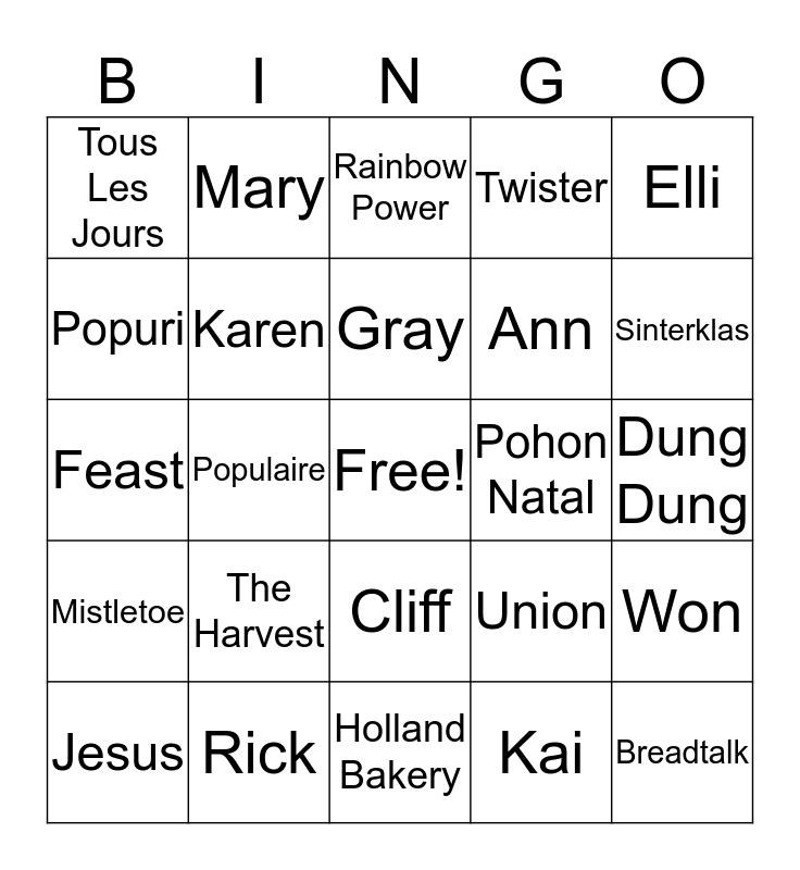 This bingo card has a free space and 24 words: Jesus, The Harvest, Gray, Kai, Elli, Tous Les Jours, Mary, Rainbow Power, Pohon Natal, Dung Dung, Feast, Karen, Union, Won, Popuri, Rick, Holland Bakery, Twister, Sinterklas, Mistletoe, Populaire, Cliff, Ann and Breadtalk.