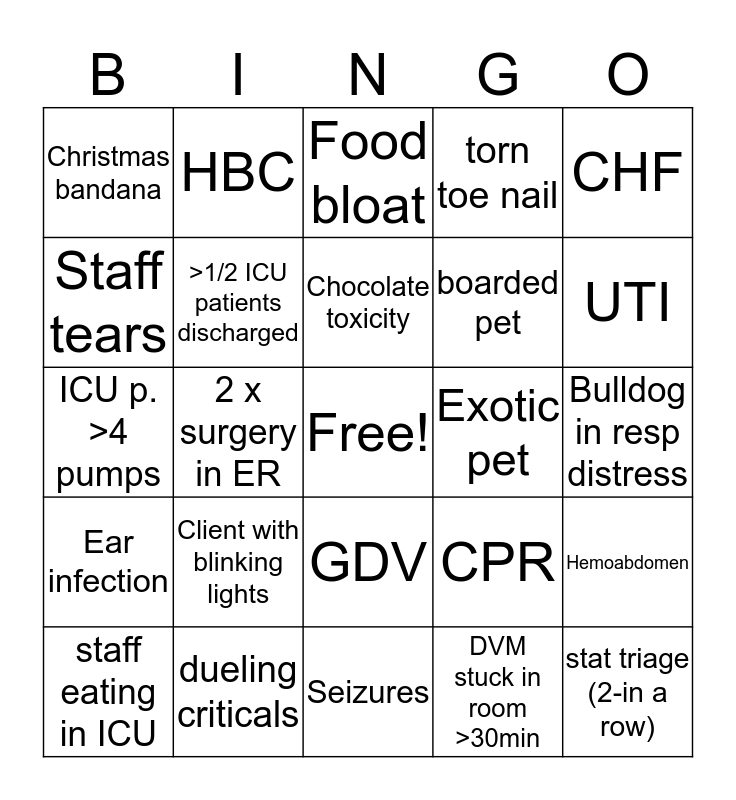 This bingo card has a free space and 64 words: Dog in sweater, Cat in sweater, O. in PJs, Hemoabdomen, DBW, Cat bite abscess, HBC, PTS x4, Chocolate toxicity, Pet ate food off table, GDV, Proptosed eye, Bulldog in resp distress, CHF, Allergic reaction, Staff tears, 2 x surgery in ER, Christmas bandana, Pet sitter presents, boarded pet, Client with blinking lights, Ear infection, torn toe nail, coughing x 2 weeks, V+ or D+ x 3+ days, ate clothing, UO, all ipads dead, client brings us treats, owner wearing santa hat, Matching family outfits, Whole family in exam room, dystocia, lymphoma, UTI, staff eating in ICU, intern Sx, DVM stuck in room >30min, >25 in ICU, >1/2 ICU patients discharged, ICU p. >4 pumps, Exotic pet, DVM needs a pen, >10 P. waiting, DVM places IV cath, stat triage (2-in a row), dueling criticals, out of O2 kennels, CPR, Staff call out, Parvo pup, itchy pitbull, Seizures, eye ulcer, draining mass, AG expression, Food bloat, Phones ringing non-stop, Induce vomiting, ate ornament, Muzzled shepherd, Fracture Italian Greyhound, 'Down' doxie and kennel door falls off.