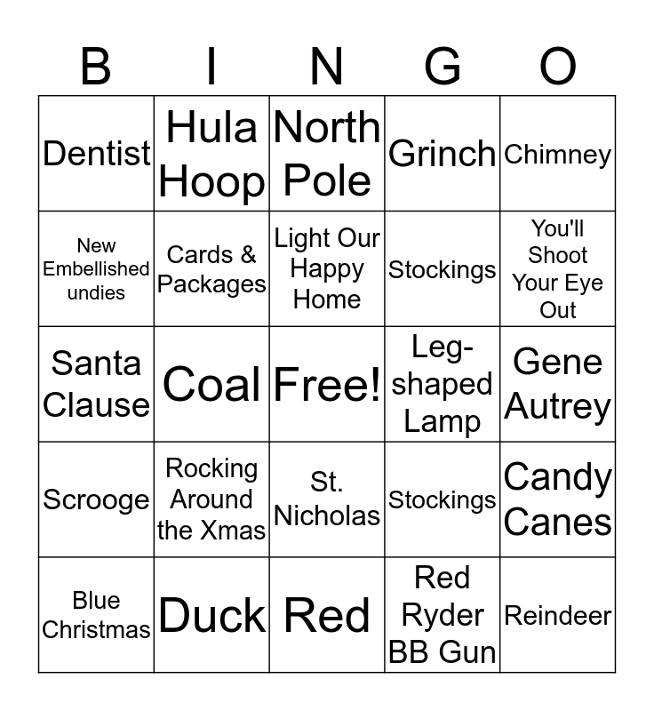 This bingo card has a free space and 26 words: St. Nicholas, Red Ryder BB Gun, Light Our Happy Home, Duck, Chimney, Dentist, New Embellished undies, Hula Hoop, Gene Autrey, Stockings, Stockings, Santa Clause, Candy Canes, Blue Christmas, Coal, Cookies, Grinch, Scrooge, North Pole, Reindeer, You'll Shoot Your Eye Out, Red, Leg-shaped Lamp, Rocking Around the Xmas, Cards & Packages and Kay.