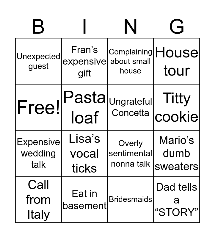 This bingo card has 16 words: Eat in basement, Mario’s dumb sweaters, Complaining about small house, Unexpected guest, Expensive wedding talk, Fran’s expensive gift, Overly sentimental nonna talk, Bridesmaids, Free!, Pasta loaf, Call from Italy, House tour, Lisa’s vocal ticks, Titty cookie, Ungrateful Concetta and Dad tells a “STORY”.