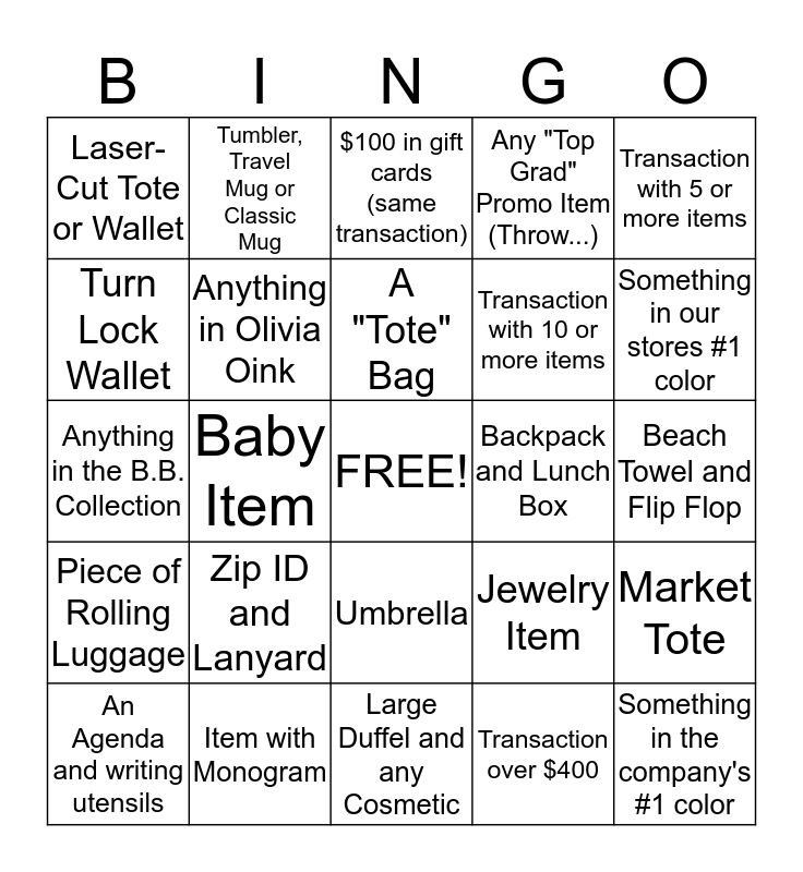 This bingo card has a free space and 24 words: Zip ID and Lanyard, Item with Monogram, A "Tote" Bag, An Agenda and writing utensils, Transaction with 5 or more items, Laser-Cut Tote or Wallet, Turn Lock Wallet, Tumbler, Travel Mug or Classic Mug, Backpack and Lunch Box, Umbrella, Transaction with 10 or more items, Anything in the B.B. Collection, Jewelry Item, Market Tote, Anything in Olivia Oink, Transaction over $400, Beach Towel and Flip Flop, $100 in gift cards (same transaction), Something in our stores #1 color, Baby Item, Something in the company's #1 color, Piece of Rolling Luggage, Any "Top Grad" Promo Item (Throw...) and Large Duffel and any Cosmetic.