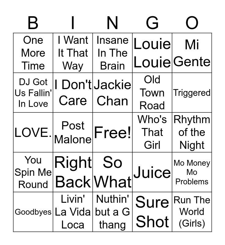 This bingo card has a free space and 100 words: Forget You, Lean On, Rhythm of the Night, High Hopes, Push It, Super Freak, Mambo No. 5, U Can't Touch This, Basket Case, All Night Long, I Love It, Gettin' Jiggy With It, Gangnam Style, Livin' La Vida Loca, I Like It, Dance Monkey, Old Town Road, Jump Around, Temperature, It Wasn't Me, Tik Tok, bad guy, Ballin', Truth Hurts, Circles, Who's That Girl, Mi Gente, Juice, X Gon' Give It To Ya, The Way, Post Malone, One More Time, Nice For What, Writing On the Wall, Sure Shot, Jackie Chan, Mo Money Mo Problems, Fantasy, Where The Party At, I Wish, What I Got, Foxy Lady, LOVE., No Scrubs, Triggered, Insane In The Brain, Jump, Mama Said Knock You Out, Whoomp! (There It Is), Nuthin' but a G thang, Whatta Man, Wanna Be Startin' Something, 1999, Maniac, Wake Me Up Before You Go Go, Never Gonna Give You Up, American Woman, Ring My Bell, My Sharona, Louie Louie, Down On the Corner, Senorita, I Wanna Dance with Somebody, Valerie, September, One Way or Another, I'm Coming Out, The Sign, No Letting Go, Come Thru, 10,000 Hours, Right Back, What Am I, Summer Days, Beautiful Girls, Hollback Girl, Oops! I Did It Again, DJ Got Us Fallin' In Love, Wrecking Ball, 1985, Ignition (Remix), Run The World (Girls), Sk8er Boi, So What, Bye Bye Bye, I Want It That Way, Bills, Bills, Bills, Mmm Mmm Mmm Mmm, Africa, You Spin Me Round, Born This Way, 24K Magic, Memories, Goodbyes, I Don't Care, Walk Me Home, Hey Look Ma, I Made It, Sucker, 7 Rings and Vacation.