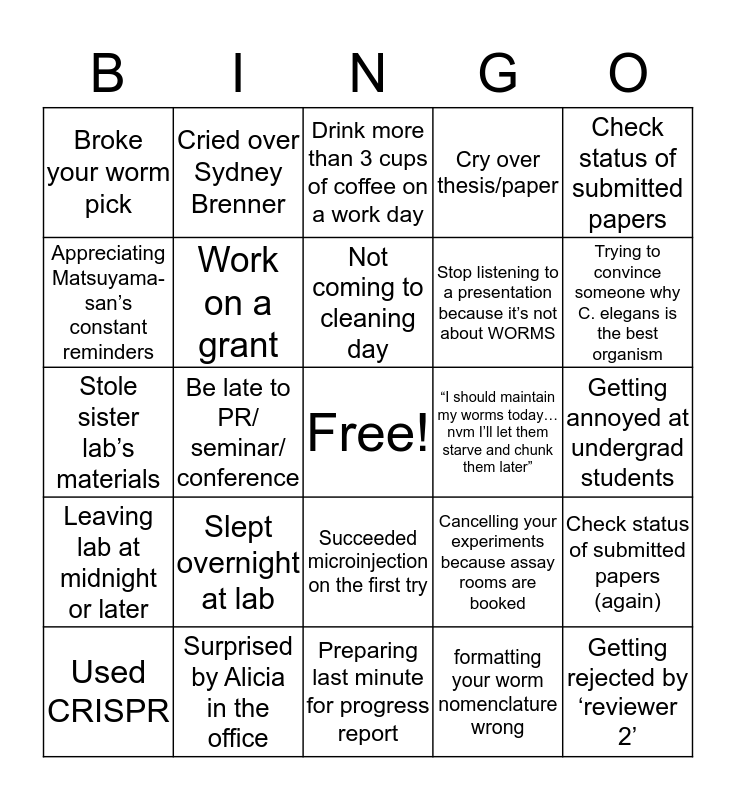 This bingo card has a free space and 25 words: Slept overnight at lab, Preparing last minute for progress report, Not coming to cleaning day, Used CRISPR, Check status of submitted papers, Broke your worm pick, Appreciating Matsuyama-san’s constant reminders, Cried over Sydney Brenner, “I should maintain my worms today… nvm I’ll let them starve and chunk them later”, Succeeded microinjection on the first try, Stop listening to a presentation because it’s not about WORMS, Stole sister lab’s materials, Cancelling your experiments because assay rooms are booked, Check status of submitted papers (again), Work on a grant, Got plates contaminated, Getting annoyed at undergrad students, Drink more than 3 cups of coffee on a work day, Trying to convince someone why C. elegans is the best organism, Be late to PR/ seminar/ conference, Getting rejected by ‘reviewer 2’, Surprised by Alicia in the office, Leaving lab at midnight or later, Cry over thesis/paper and formatting your worm nomenclature wrong.