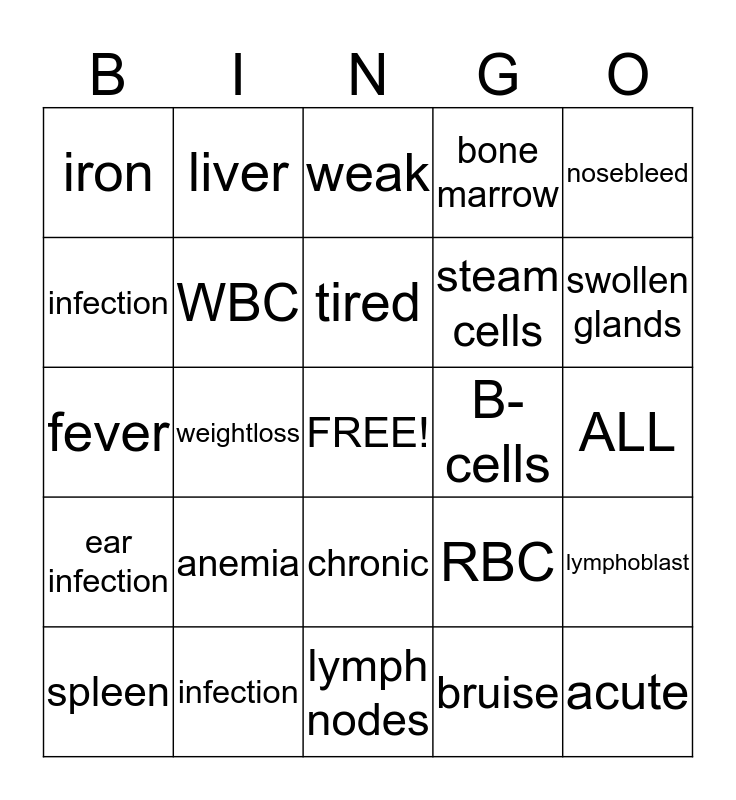 This bingo card has a free space and 24 words: anemia, infection, tired, spleen, nosebleed, iron, infection, liver, B-cells, chronic, steam cells, fever, RBC, lymphoblast, WBC, bruise, ALL, weak, swollen glands, weightloss, acute, ear infection, bone marrow and lymph nodes.