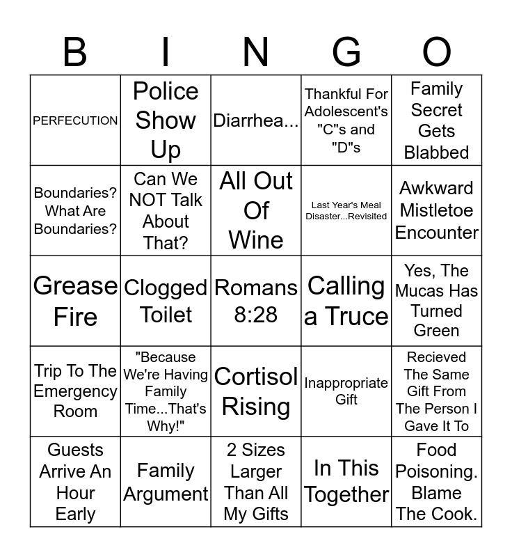 This bingo card has a free space and 28 words: Recieved The Same Gift From The Person I Gave It To, Fake Interest In Someone's Five Minute Story, Last Year's Meal Disaster...Revisited, In This Together, Boundaries? What Are Boundaries?, Diarrhea..., Police Show Up, Trip To The Emergency Room, Calling a Truce, Guests Arrive An Hour Early, Grease Fire, Thankful For Adolescent's "C"s and "D"s, Family Argument, 2 Sizes Larger Than All My Gifts, Awkward Mistletoe Encounter, Extrovert Hugging The Introvert, "Because We're Having Family Time...That's Why!", Can We NOT Talk About That?, All Out Of Wine, Cortisol Rising, PERFECUTION, Snowed In...All Week, Food Poisoning. Blame The Cook., Clogged Toilet, Yes, The Mucas Has Turned Green, Inappropriate Gift, Family Secret Gets Blabbed and Overnight Guests Over Stay.