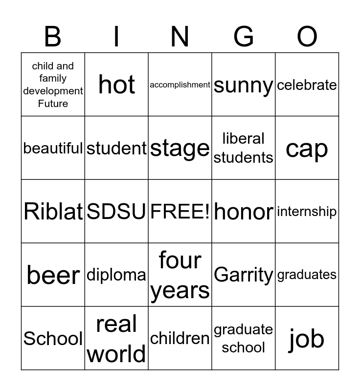This bingo card has a free space and 29 words: School, San Diego, SDSU, Commencement, child and family development Future, accomplishment, student, diploma, honor, real world, internship, job, children, graduate school, cap, gown, four years, beer, celebrate, Riblat, Garrity, education, liberal students, beautiful, sunny, hot, graduates, stage and viejas.