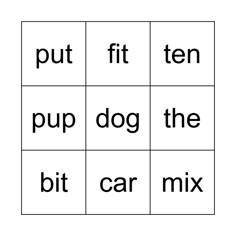 This bingo card has 15 words: one, two, ten, put, car, dog, cat, fun, the, mix, ill, pup, bit, fit and bob.