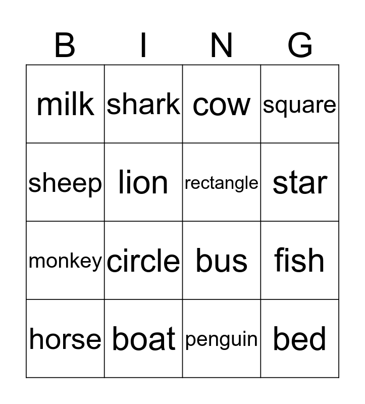 This bingo card has 27 words: Free!, octopus, monkey, tiger, lion, cow, shark, bed, boat, train, bus, square, triangle, diamond, circle, heart, rectangle, star, moon, milk, penguin, duck, fish, horse, airplane, sheep and crab.