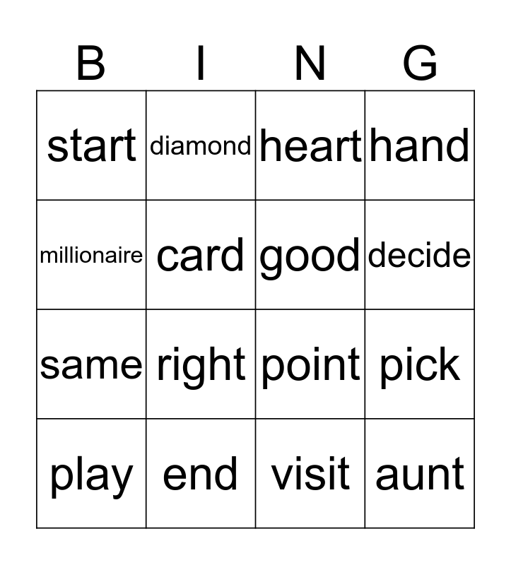 This bingo card has 32 words: came, dice, visit, cousin, play, card, heart, shuffle, millionaire, have to, good, hand, won, threw, land, end, money, right, uncle, aunt, baby, newborn, sweet, cuddle, same, diamond, point, decide, start, end, many and pick.