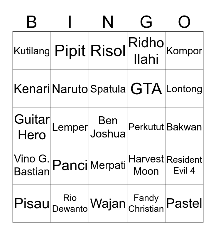 This bingo card has 25 words: Panci, Wajan, Spatula, Pisau, Kompor, Kutilang, Kenari, Pipit, Perkutut, Merpati, GTA, Guitar Hero, Harvest Moon, Resident Evil 4, Naruto, Pastel, Bakwan, Risol, Lontong, Lemper, Ben Joshua, Rio Dewanto, Vino G. Bastian, Ridho Ilahi and Fandy Christian.