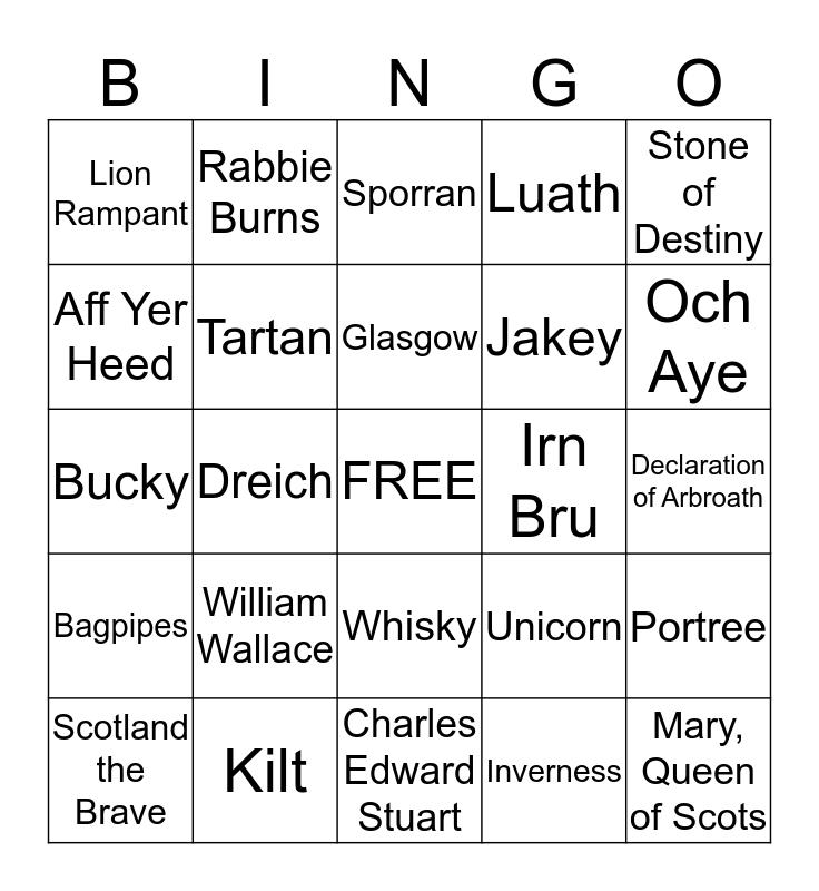 This bingo card has a free space and 34 words: Haggis, Inverness, Nessie, Saltire, Bagpipes, Tartan, Stone of Destiny, Scotland the Brave, Rabbie Burns, Sassenach, Glasgow, Sporran, Thistle, Aberdeen, Irn Bru, Och Aye, Kilt, Bucky, William Wallace, Unicorn, Whisky, Edinburgh, Lion Rampant, Declaration of Arbroath, Charles Edward Stuart, Mary, Queen of Scots, Luath, Walloper, Jakey, Aff Yer Heed, Square Go, Dreich, Portree and Numpty.