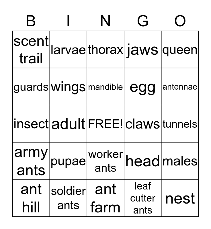 This bingo card has a free space and 24 words: pupae, soldier ants, mandible, ant hill, queen, scent trail, guards, larvae, claws, worker ants, egg, insect, head, males, wings, leaf cutter ants, tunnels, thorax, antennae, adult, nest, army ants, jaws and ant farm.