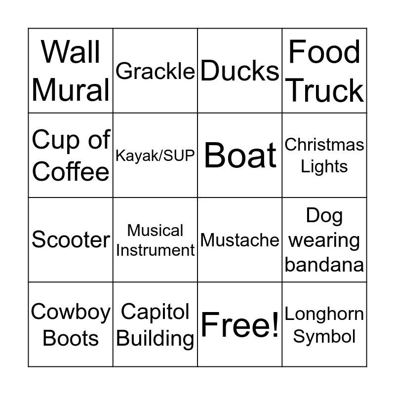 This bingo card has 17 words: Free!, Cowboy Boots, Ducks, Wall Mural, Musical Instrument, Food Truck, Dog wearing bandana, Boat, Christmas Lights, Kayak/SUP, Capitol Building, Mustache, Cup of Coffee, Grackle, Scooter, Word: Austin and Longhorn Symbol.