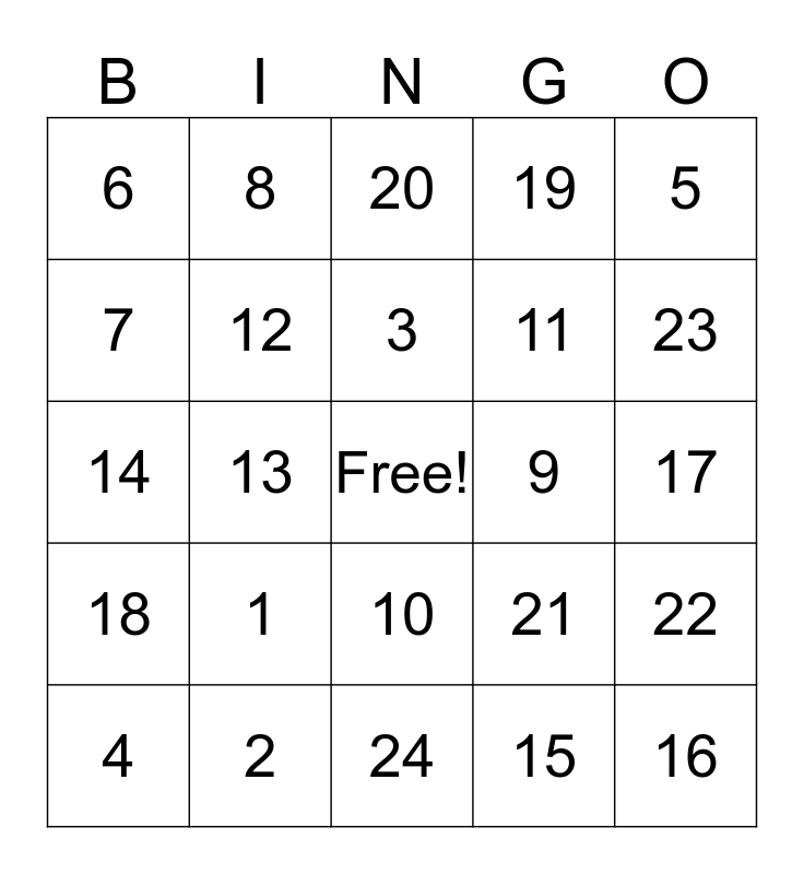 This bingo card has a free space and 24 words: 1, 2, 3, 4, 5, 6, 7, 8, 9, 10, 11, 14, 21, 22, 12, 15, 17, 20, 23, 13, 16, 18, 19 and 24.