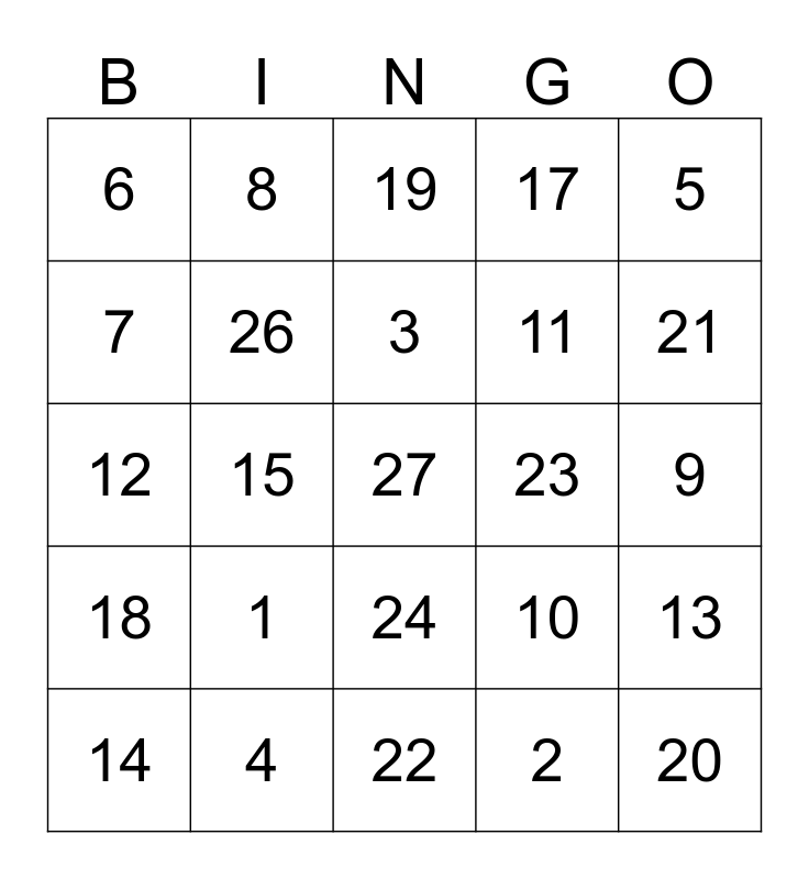 This bingo card has a free space and 26 words: 24, 2, 3, 4, 5, 6, 7, 8, 9, 10, 11, 12, 13, 14, 15, 16, 17, 18, 19, 20, 21, 22, 23, 1, 26 and 25.