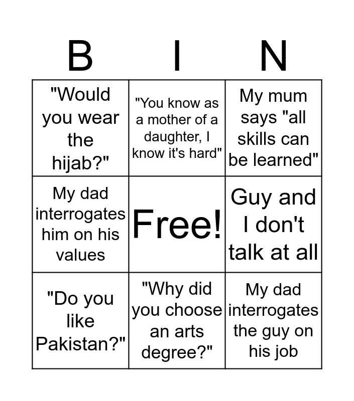 This bingo card has a free space and 11 words: Talk to only his mum/Sister all night, "Why did you choose an arts degree?", My dad interrogates the guy on his job, "Do you like Pakistan?", "You know as a mother of a daughter, I know it's hard", My mum says "all skills can be learned", Guy and I don't talk at all, "What do you think of housewives?", My dad interrogates him on his values, "Would you wear the hijab?" and Get asked if I can cook/ did I cook anything tonight?.