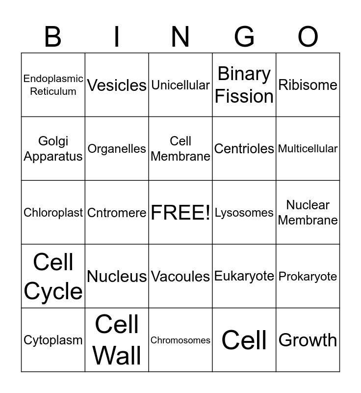 This bingo card has a free space and 24 words: Nucleus, Cell Wall, Cell Membrane, Cytoplasm, Ribisome, Endoplasmic Reticulum, Golgi Apparatus, Vesicles, Lysosomes, Vacoules, Centrioles, Chloroplast, Eukaryote, Prokaryote, Organelles, Cell, Nuclear Membrane, Unicellular, Multicellular, Cntromere, Growth, Cell Cycle, Binary Fission and Chromosomes.