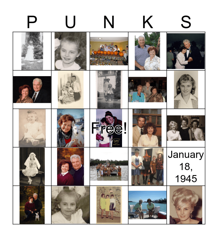 This bingo card has 32 images, a free space and 2 words: January 18, 1945 and June 26, 1976.