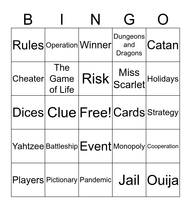 This bingo card has a free space and 29 words: Players, Parties, Clue, Loser, Rules, Winner, The Game of Life, Battleship, Cards, Pictionary, Strategy, Ouija, Pandemic, Jail, Holidays, Hat, Event, Yahtzee, Catan, Dices, Monopoly, Trivial Pursuit, Miss Scarlet, Cheater, Dungeons and Dragons, Operation, Cooperation, Risk and Role-Playing.