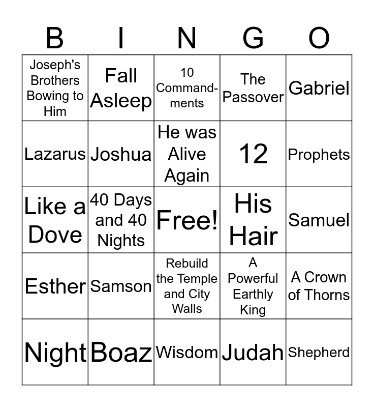 This bingo card has a free space and 29 words: Night, Serpent, 40 Days and 40 Nights, Land, Nation, Blessing, Joseph's Brothers Bowing to Him, 10 Command-ments, Joshua, Samson, His Hair, Boaz, Samuel, Shepherd, Wisdom, Judah, Prophets, The Lion's Den, Rebuild the Temple and City Walls, Esther, Gabriel, Like a Dove, A Powerful Earthly King, "Peace, Be Still", 12, Lazarus, The Passover, Fall Asleep, A Crown of Thorns, He was Alive Again and To Teach About Jesus.