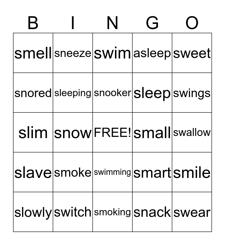This bingo card has a free space and 24 words: smoke, switch, snooker, slowly, sweet, smell, snored, sneeze, small, swimming, sleep, slim, smart, smile, sleeping, snack, swallow, swim, swings, snow, swear, slave, asleep and smoking.