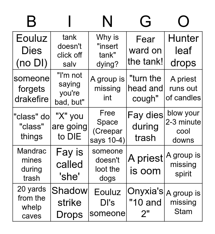 This bingo card has a free space and 24 words: Fay is called 'she', Shadow strike Drops, A group is missing int, 20 yards from the whelp caves, Hunter leaf drops, Eouluz Dies (no DI), someone forgets drakefire, tank doesn't click off salv, Fay dies during trash, someone doesn't loot the dogs, "turn the head and cough", "class" do "class" things, A priest is oom, A group is missing spirit, "I'm not saying you're bad, but", Onyxia's "10 and 2", blow your 2-3 minute cool downs, Why is "insert tank" dying?, A priest runs out of candles, "X" you are going to DIE, A group is missing Stam, Mandrac mines during trash, Fear ward on the tank! and Eouluz DI's someone.