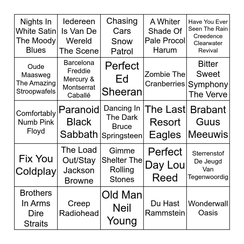 This bingo card has 50 words: Zij Gelooft In Mij André Hazes, Dancing In The Dark Bruce Springsteen, Fast Car Tracy Chapman, Old Man Neil Young, The Load Out/Stay Jackson Browne, One Day Like This Elbow, Iedereen Is Van De Wereld The Scene, Hurricane Bob Dylan, Oude Maasweg The Amazing Stroopwafels, Kronenburg Park Frank Boeijen Groep, Barcelona Freddie Mercury & Montserrat Caballé, A Whiter Shade Of Pale Procol Harum, Sterrenstof De Jeugd Van Tegenwoordig, Perfect Day Lou Reed, Smoke On The Water Deep Purple, Streets Of Philadelphia Bruce Springsteen, Perfect Ed Sheeran, The Last Resort Eagles, Wuthering Heights Kate Bush, Have You Ever Seen The Rain Creedence Clearwater Revival, Paranoid Black Sabbath, Du Hast Rammstein, Nights In White Satin The Moody Blues, Zombie The Cranberries, Losing My Religion R.E.M., Wonderwall Oasis, Bitter Sweet Symphony The Verve, Stil In Mij Van Dik Hout, Chasing Cars Snow Patrol, Gimme Shelter The Rolling Stones, Where The Streets Have No Name U2, Tears In Heaven Eric Clapton, Angels Robbie Williams, Iron Sky Paolo Nutini, Creep Radiohead, Riders On The Storm The Doors, Mr. Blue Sky Electric Light Orchestra, God Only Knows The Beach Boys, Alive Pearl Jam, Brabant Guus Meeuwis, Shallow Lady Gaga & Bradley Cooper, Telegraph Road Dire Straits, Oceaan Racoon, Hurt Johnny Cash, Brothers In Arms Dire Straits, Comfortably Numb Pink Floyd, November Rain Guns N' Roses, De Boer Dat Is De Keerl Normaal, Fix You Coldplay and Roller Coaster Danny Vera.