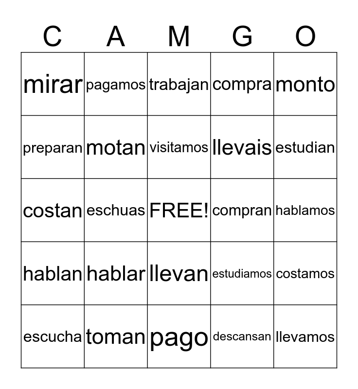 This bingo card has a free space and 24 words: hablar, toman, visitamos, escucha, monto, mirar, preparan, pagamos, compran, llevan, llevais, costan, estudiamos, costamos, motan, descansan, hablamos, trabajan, estudian, eschuas, llevamos, hablan, compra and pago.