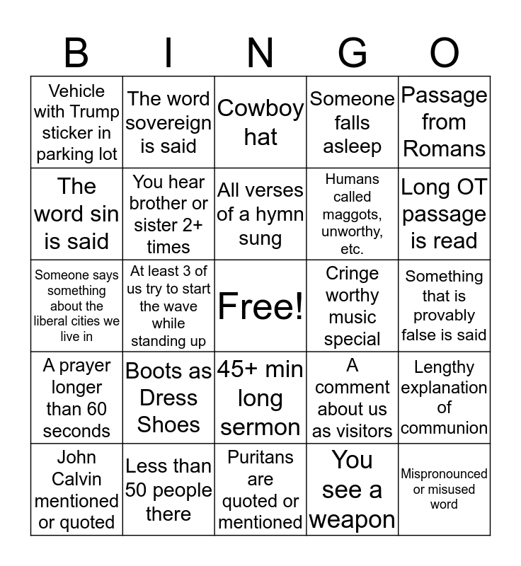 This bingo card has a free space and 24 words: Boots as Dress Shoes, Less than 50 people there, All verses of a hymn sung, John Calvin mentioned or quoted, Passage from Romans, Vehicle with Trump sticker in parking lot, The word sin is said, The word sovereign is said, Cringe worthy music special, 45+ min long sermon, Humans called maggots, unworthy, etc., Someone says something about the liberal cities we live in, A comment about us as visitors, Lengthy explanation of communion, You hear brother or sister 2+ times, You see a weapon, Something that is provably false is said, Cowboy hat, Long OT passage is read, At least 3 of us try to start the wave while standing up, Mispronounced or misused word, A prayer longer than 60 seconds, Someone falls asleep and Puritans are quoted or mentioned.