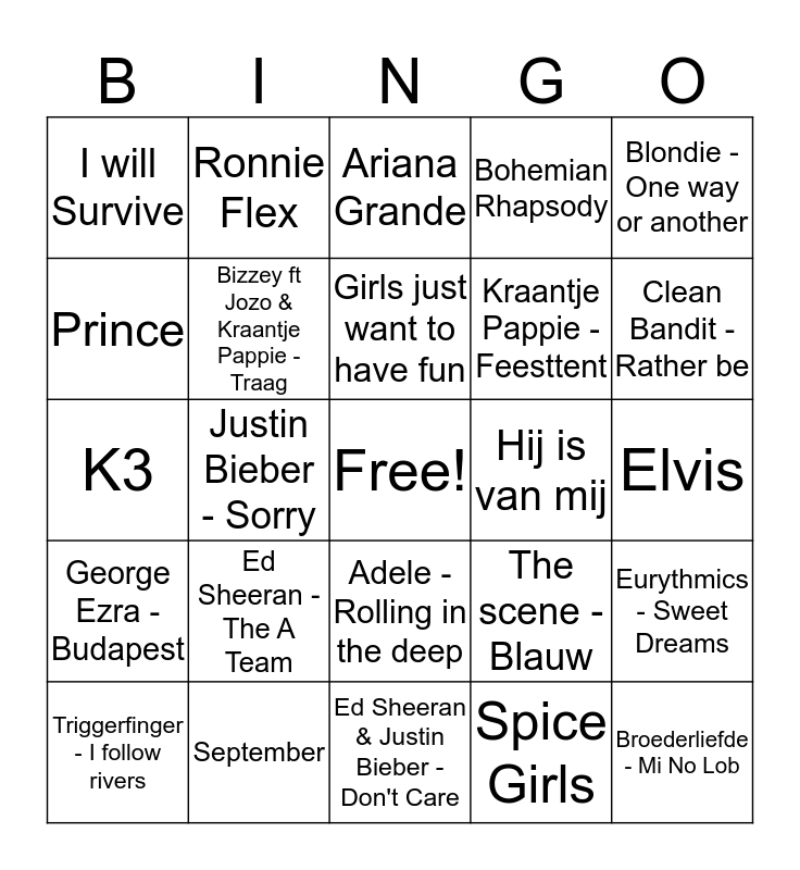 This bingo card has a free space and 26 words: Adele - Rolling in the deep, Spice Girls, Girls just want to have fun, September, Blondie - One way or another, I will Survive, Prince, Ronnie Flex, Elvis, The scene - Blauw, Kraantje Pappie - Feesttent, K3, Eurythmics - Sweet Dreams, Triggerfinger - I follow rivers, Justin Bieber - Sorry, Zayn - Pillow Talk, Bohemian Rhapsody, George Ezra - Budapest, Ariana Grande, Broederliefde - Mi No Lob, Clean Bandit - Rather be, Ed Sheeran & Justin Bieber - Don't Care, Hij is van mij, Ed Sheeran - The A Team, Bizzey ft Jozo & Kraantje Pappie - Traag and Calvin Harris ft Katy Perry - Feels.