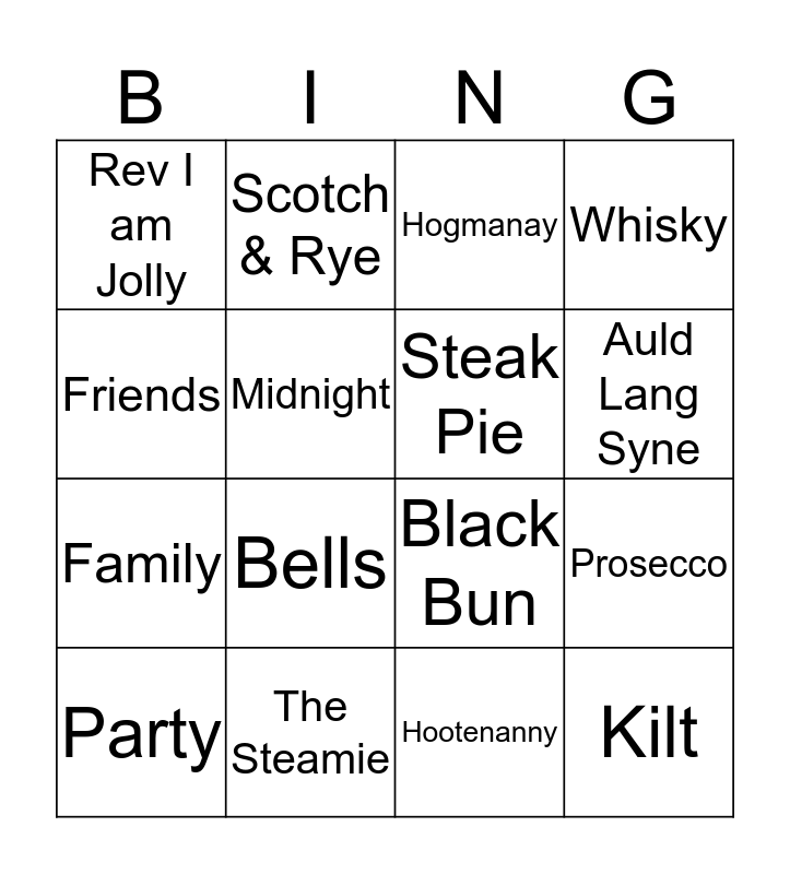 This bingo card has 20 words: Party, 1st footing, Hogmanay, Prosecco, New Years resolution, Bells, Hootenanny, Whisky, Family, Scotch & Rye, Black Bun, Auld Lang Syne, Rev I am Jolly, The Steamie, Steak Pie, Bagpipes, Friends, Midnight, Fireworks and Kilt.