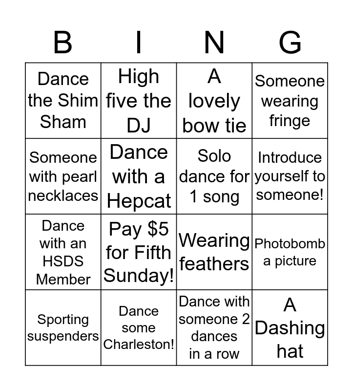 This bingo card has 19 words: Wearing feathers, Dance to Puttin' on the Ritz, A lovely bow tie, A Dashing hat, Photobomb a picture, Someone with pearl necklaces, Dance with someone 2 dances in a row, Dance the Shim Sham, High five the DJ, Dance with an HSDS Member, Pay $5 for Fifth Sunday!, Dance with a Hepcat, Solo dance for 1 song, Dance some Charleston!, Sporting suspenders, Dance with 10 different people, Someone wearing fringe, Introduce yourself to someone! and Initiate a steal dance.