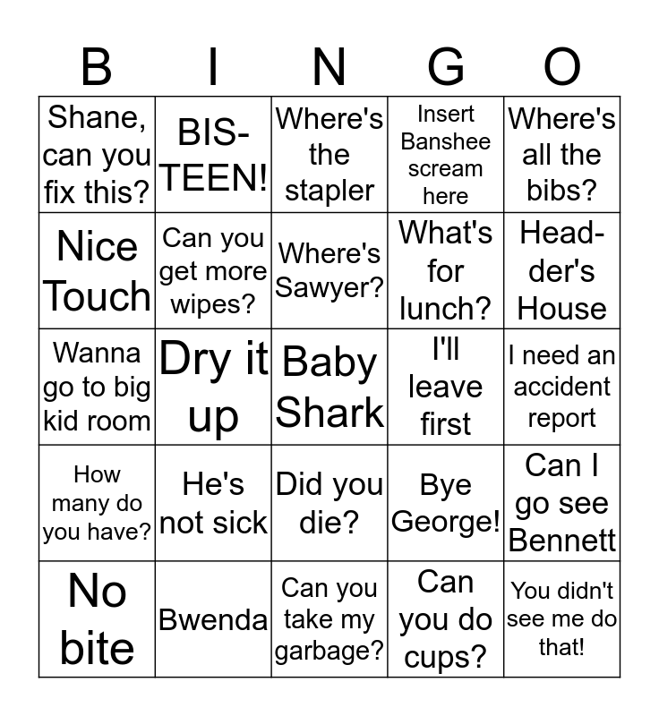 This bingo card has a free space and 39 words: Did you have fun?, You're fine, Can you make copies?, Can you get more wipes?, No bite, Did you die?, Where's Sawyer?, I want chips, Where's all the bibs?, How many do you have?, Dry it up, Insert Banshee scream here, You didn't see me do that!, I need an accident report, I'll leave first, He's not sick, All Done, Shane, can you fix this?, He's just teething, Bye George!, Nice Touch, Can you take my garbage?, What's for lunch?, Head-der's House, Where do her toys go?, Your teeth are for food only!, Office...I have to pee, He needs 2 jackets, Go Potty, BIS-TEEN!, Wanna go to babies?, I said GOOD NIGHT, Where's the stapler, Bwenda, Can you do cups?, Stay in your room, Can I go see Bennett, Wanna go to big kid room and Go Play.