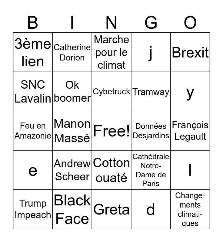 This bingo card has a free space and 25 words: Andrew Scheer, Greta, Cybetruck, Trump Impeach, Brexit, 3ème lien, SNC Lavalin, Catherine Dorion, Données Desjardins, Cotton ouaté, Tramway, Feu en Amazonie, Cathédrale Notre-Dame de Paris, l, Ok boomer, Justin Trudeau, François Legault, Marche pour le climat, y, Manon Massé, Change-ments climati-ques, Black Face, e, j and d.