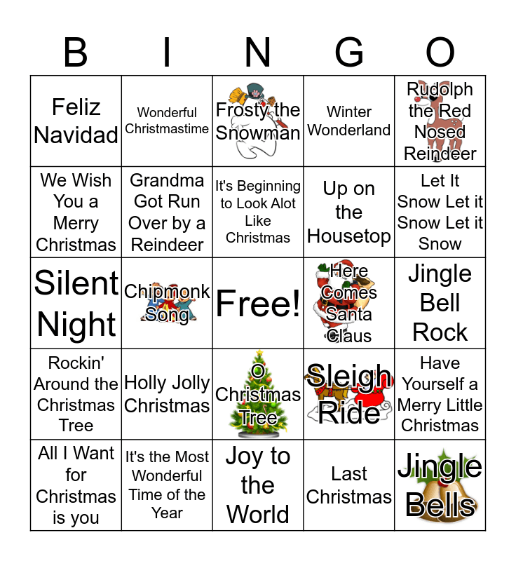 This bingo card has 7 images, a free space and 29 words: All I Want for Christmas is you, Baby It's Cold Outside, Chipmonk Song, Deck the Halls, Feliz Navidad, Frosty the Snowman, Grandma Got Run Over by a Reindeer, Holly Jolly Christmas, Here Comes Santa Claus, It's the Most Wonderful Time of the Year, Jingle Bell Rock, Jingle Bells, Joy to the World, Last Christmas, Let It Snow Let it Snow Let it Snow, Mary, Did You Know, O Christmas Tree, Rockin' Around the Christmas Tree, Rudolph the Red Nosed Reindeer, Silent Night, Sleigh Ride, Twelve Days of Christmas, Up on the Housetop, We Wish You a Merry Christmas, Winter Wonderland, Wonderful Christmastime, Have Yourself a Merry Little Christmas, It's Beginning to Look Alot Like Christmas and Little Drummer Boy.