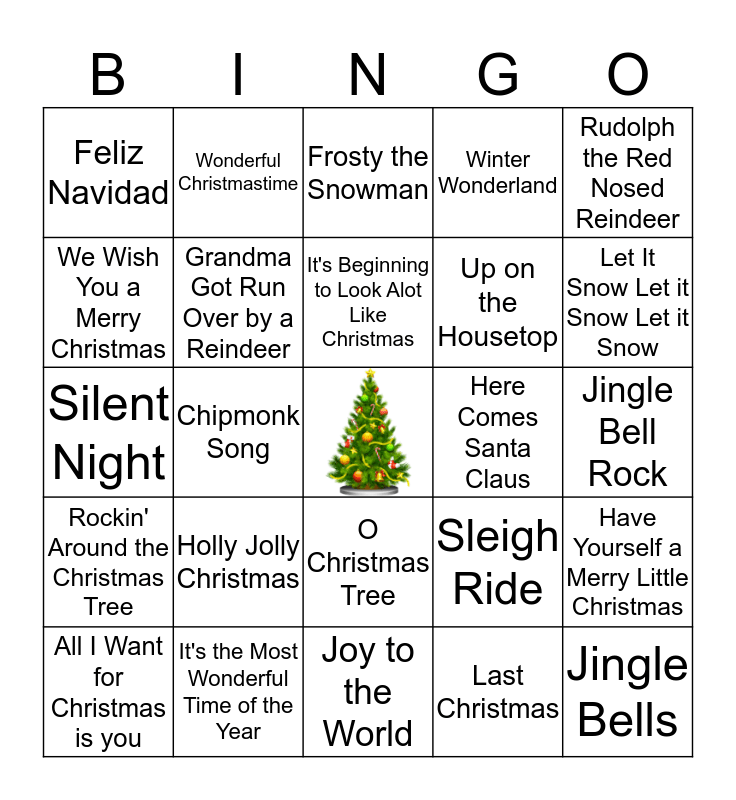 This bingo card has a free space and 29 words: All I Want for Christmas is you, Baby It's Cold Outside, Chipmonk Song, Deck the Halls, Feliz Navidad, Frosty the Snowman, Grandma Got Run Over by a Reindeer, Holly Jolly Christmas, Here Comes Santa Claus, It's the Most Wonderful Time of the Year, Jingle Bell Rock, Jingle Bells, Joy to the World, Last Christmas, Let It Snow Let it Snow Let it Snow, Mary, Did You Know, O Christmas Tree, Rockin' Around the Christmas Tree, Rudolph the Red Nosed Reindeer, Silent Night, Sleigh Ride, Twelve Days of Christmas, Up on the Housetop, We Wish You a Merry Christmas, Winter Wonderland, Wonderful Christmastime, Have Yourself a Merry Little Christmas, It's Beginning to Look Alot Like Christmas and Little Drummer Boy.