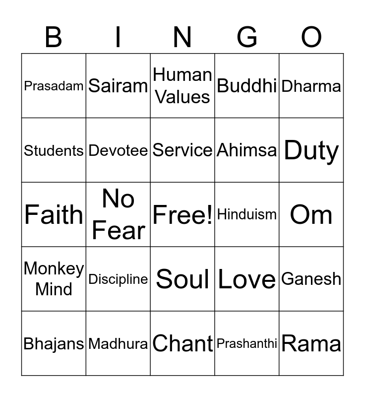 This bingo card has a free space and 75 words: Intellect, Fruits, Human Values, Sita, Hurt Never, Radio Sai, Baba, Seva, Sai, Good Words, Krishna, SSE, Service, Students, Judiasm, No Fear, Universe, Rama, Divine, Dharma, Guru, Faith, Devotee, Sairam, Buddhi, Happiness, Moksha, Puttaparthi, Gayathri, Discourses, LASA, Devotion, Lord Shiva, Love, Duty, Ahimsa, Atma, Deeds, Om, Prashanthi, Self Realization, Liberation, Gratitude, Mantras, Study Circle, Thoughts, Bhajans, Prasadam, Swami, Sathya, Christianity, Soul, Mankind, Shanti, Hanuman, Self Inquiry, Charioteer, Grace, Rudram, Right Actions, Discipline, Gita, Vibhuti, Avatar, Virtues, Hinduism, Prema, Light, Mind, Ganesh, Monkey Mind, Madhura, Help Ever, Chant and Namasmarana.