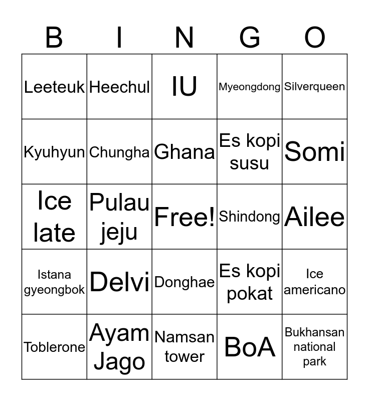 This bingo card has a free space and 24 words: Delvi, Ayam Jago, Ghana, Toblerone, Silverqueen, Leeteuk, Kyuhyun, Heechul, Shindong, Donghae, Es kopi susu, Ice late, Es kopi pokat, Ice americano, Chungha, BoA, Ailee, IU, Somi, Pulau jeju, Bukhansan national park, Istana gyeongbok, Myeongdong and Namsan tower.