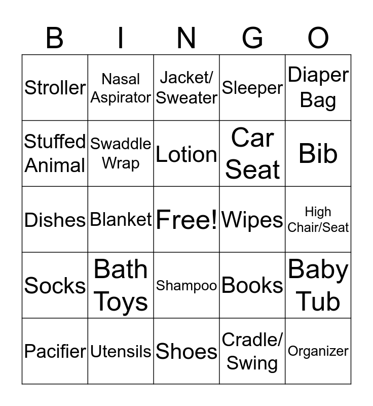 This bingo card has a free space and 40 words: Changing Pad, Dishes, Baby Carrier, Swaddle Wrap, Utensils, Shampoo, Lotion, Rattle, Diaper Bag, Socks, Blanket, Sleeper, Organizer, High Chair/Seat, Wipes, Bath Toys, Diaper Cream, Stroller, :Pants, Jacket/ Sweater, Baby Tub, Cradle/ Swing, Car Seat, Stuffed Animal, Comb/ Brush, Onesies, Cap/Hat, Powder, Bottle, Teether, Gift Card/ Money, Pacifier, Towel, Books, Bib, Shoes, Thermometer, Personalized Item, Nasal Aspirator and Baby Safety.