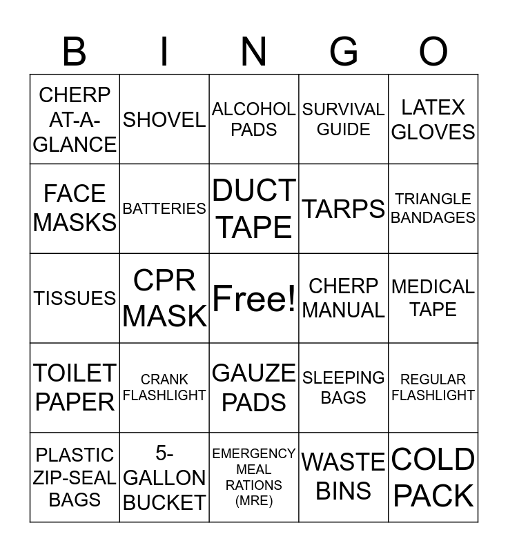 This bingo card has a free space and 37 words: GAUZE ROLL, ACE BANDAGE, BAND-AIDS, BATTERIES, REGULAR FLASHLIGHT, CRANK FLASHLIGHT, DUCT TAPE, WORK GLOVES, LATEX GLOVES, EMERGENCY BLANKET, CPR MASK, SURVIVAL GUIDE, COLD PACK, MEDICAL TAPE, FACE MASKS, TOILET PAPER, FIRST-AID KIT, ALCOHOL PADS, GAUZE PADS, CHERP MANUAL, CHERP AT-A-GLANCE, TRIANGLE BANDAGES, PLASTIC ZIP-SEAL BAGS, EMERGENCY MEAL RATIONS (MRE), EMERGENCY WATER, WASTE BINS, SHOVEL, CROWBAR, HARD HAT, POP-UP TENT, SOLAR LANTERN, 5-GALLON BUCKET, TISSUES, SAFETY GLASSES, SLEEPING BAGS, TARPS and RED EMERGENCY BACKPACK.