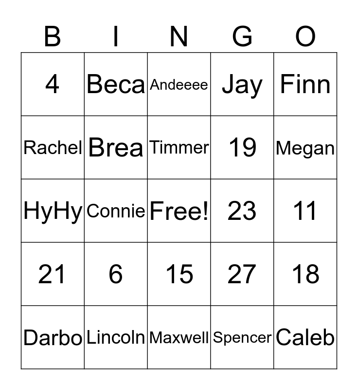 This bingo card has a free space and 74 words: Nana, Bompie, Andeeee, Scott, JD, Pretty Britty, Allie, Dan, Darbo, Jon, Stacy, Erik, Timmer, Rachel, Parker, Connie, Jarom, Megan, Cooper, HyHy, Brea, Beca, Jay, Mimi, Caleb, Emma, Macy, Jonas, Job, Zoe, Finn, Felix, Jack, Lucy, Josph, Spencer, Henry, Mable, Samara, Kate, Maxwell, Lincoln, 1, 2, 3, 4, 5, 6, 7, 8, 9, 10, 11, 12, 13, 14, 15, 16, 17, 18, 19, 20, 21, 22, 23, 24, 25, 26, 27, 28, 29, 30, 31 and 33.
