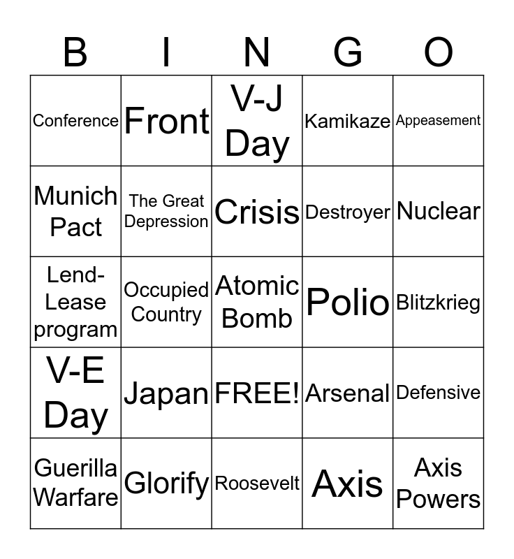 This bingo card has 26 words: FREE!, Axis, Crisis, Glorify, Appeasement, Conference, Munich Pact, Front, Blitzkrieg, Arsenal, Destroyer, Lend-Lease program, Defensive, Guerilla Warfare, Occupied Country, D-Day, Kamikaze, V-E Day, V-J Day, Atomic Bomb, Nuclear, Roosevelt, Polio, Japan, The Great Depression and Axis Powers.
