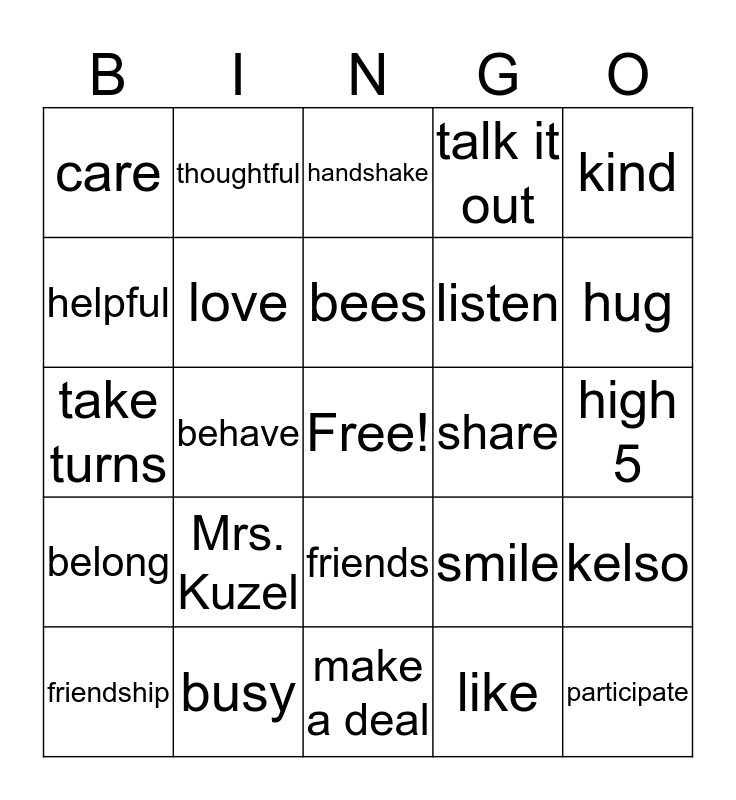 This bingo card has a free space and 24 words: Mrs. Kuzel, busy, bees, friendship, kind, care, helpful, thoughtful, share, friends, listen, take turns, smile, kelso, love, like, high 5, handshake, hug, behave, participate, belong, talk it out and make a deal.