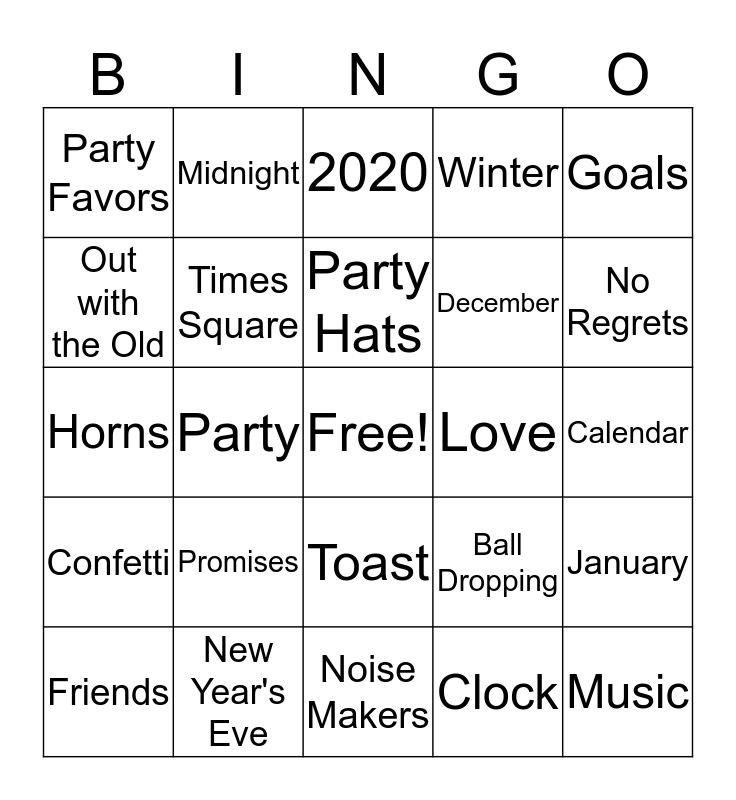 This bingo card has a free space and 33 words: Celebrate, Countdown, Party Hats, Memories, Calendar, Party Favors, Times Square, Noise Makers, December, Music, Out with the Old, Midnight, Clock, Balloons, Horns, Party, Toast, Ball Dropping, January, Confetti, New Year's Eve, Fireworks, Winter, No Regrets, Christ, Promises, 2020, Love, Goals, Friends, Prayers, Peace and Laughs.