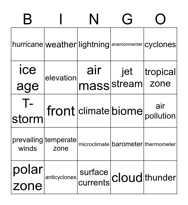 This bingo card has a free space and 24 words: temperate zone, anticyclones, air mass, polar zone, cyclones, hurricane, ice age, weather, biome, microclimate, jet stream, T-storm, barometer, thermometer, elevation, cloud, air pollution, lightning, tropical zone, front, thunder, prevailing winds, anemonmenter and surface currents.