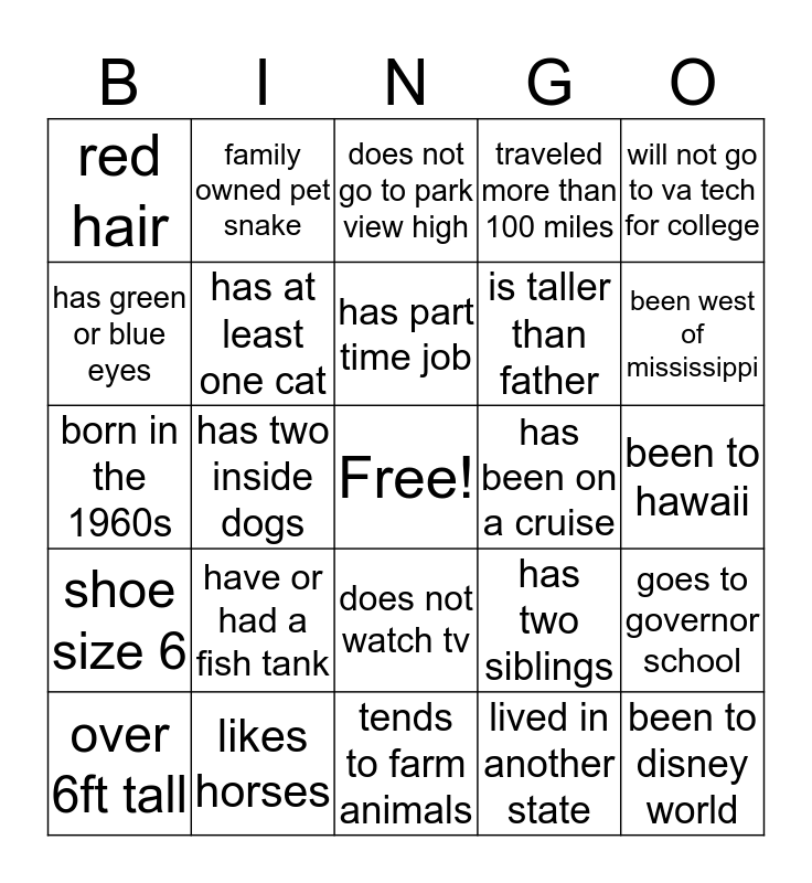 This bingo card has a free space and 29 words: left handed, likes horses, does not go to park view high, not born in mecklenburg va, will not go to va tech for college, red hair, has at least one cat, has part time job, has been on a cruise, goes to governor school, over 6ft tall, has two inside dogs, lived in another state, been to disney world, born in the 1960s, has had a hamster, tends to farm animals, has two siblings, been west of mississippi, shoe size 6, have or had a fish tank, plays two sports at school, is taller than father, been to hawaii, has green or blue eyes, family owned pet snake, does not watch tv, traveled more than 100 miles and been baptistized.